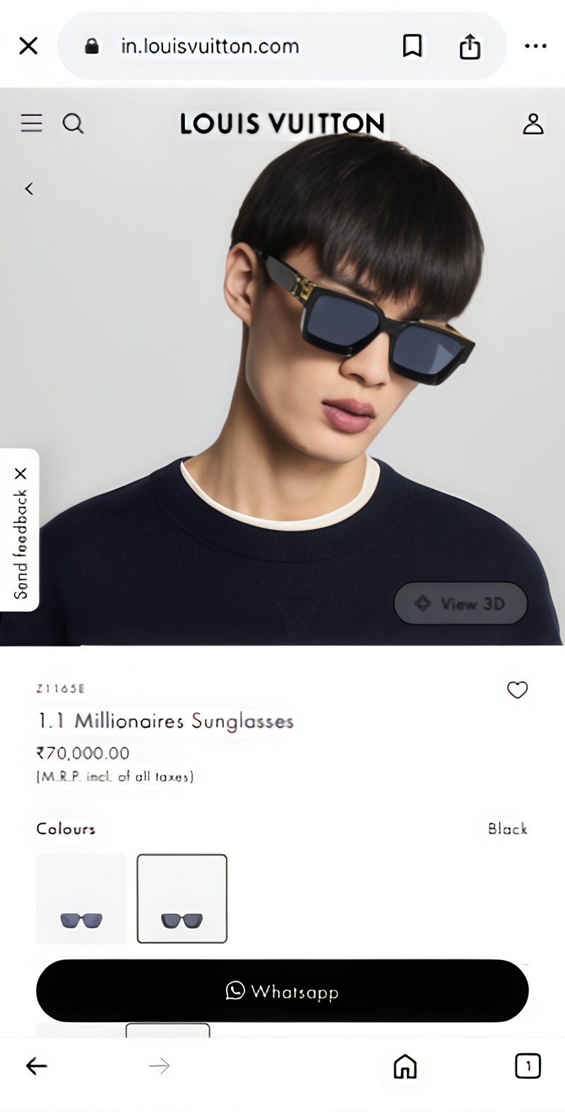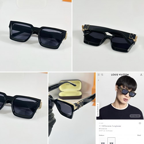 Product Description: Design & Aesthetics: These sunglasses feature a bold, square or rectangular frame, typically in black or a dark color, with prominent gold-toned metal accents on the hinges and temples, often engraved with the Louis Vuitton signature or LV logo. Materials: Crafted with high-quality materials such as injected frames (acetate) and metal components, ensuring durability and a luxurious feel. Lenses: Equipped with dark lenses and a high filter category (e.g., Category 3), suitable for strong sunlight. Signature Details: Characteristic Louis Vuitton elements include finely engraved LV logos on the hinges or temples, and potentially subtle Monogram motifs or Damier patterns on other parts like nose pads, reflecting the brand's heritage and craftsmanship. Comfort & Fit: Designed for comfort, some models may include features like functional nose pads for an improved fit, especially for low-bridge or Asian-fit designs.