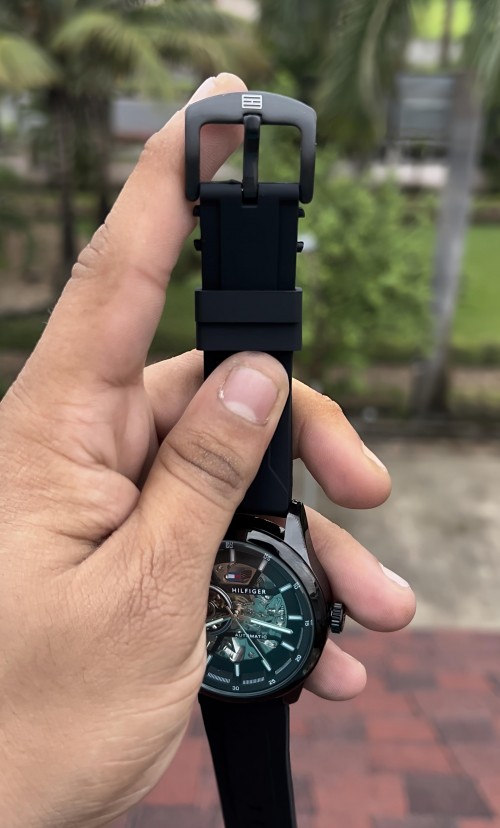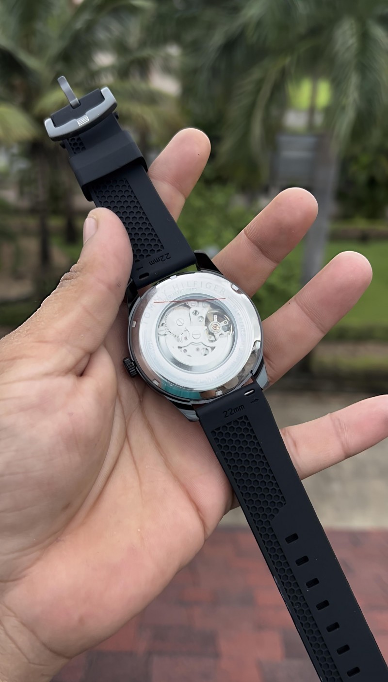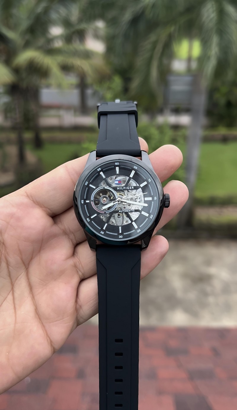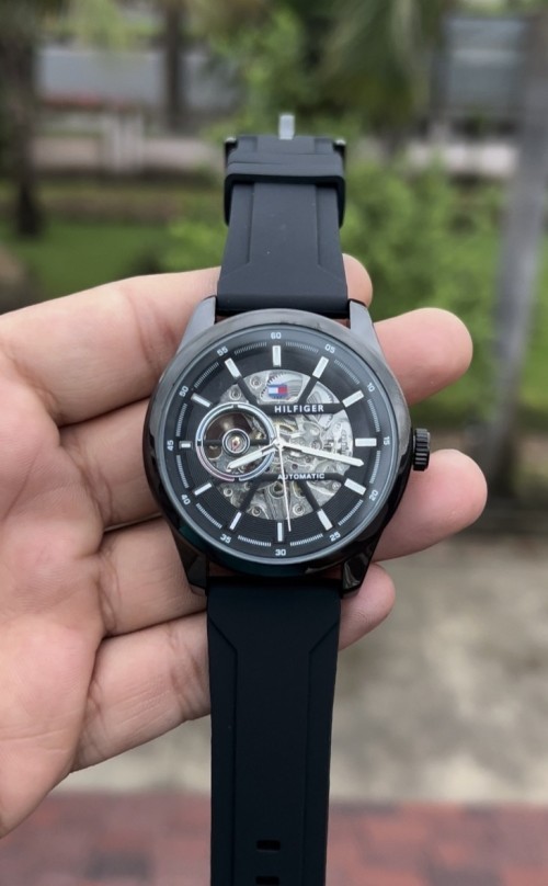 Typically features a black dial with clear markers and hands, and a visible mechanical heart through transparent front and back.